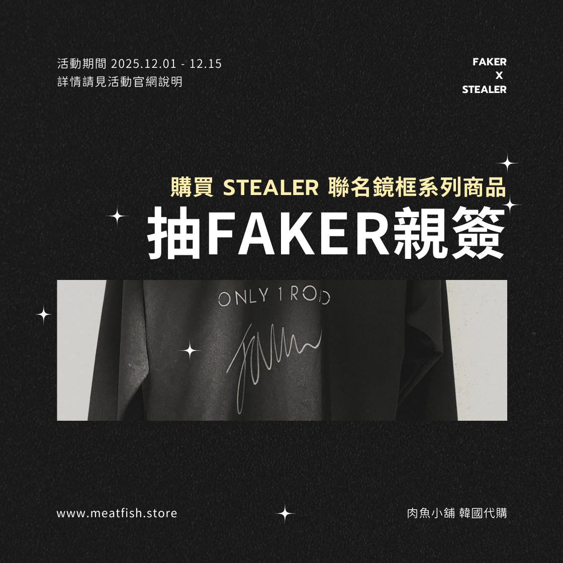 《 FAKER X STEALER 》活動指定商品頁 👓陪伴 FAKER 拿下兩座冠軍的眼鏡!超輕量鏡框,幾乎無感的配戴感,專心操作不被壓迫感打斷 貼合臉型的舒適配重,長時間看螢幕也不勒耳、不壓鼻 想跟 FAKER 擁有一樣的高專注力,就從一副戴了會忘記存在的眼鏡開始✨ 肉魚小舖 x STEALER 史上最高折扣超高中獎率等你來試試手氣💛 - ▌活動期間:2025年12月1日 至 2025年12月15日 23:59 ▌活動獎品: ■ FAKER X STEALER 親簽限定版品牌帽T (1名) ■ FAKER X STEALER 親簽眼鏡外盒 (2名) ▌活動內容:《 FAKER X STEALER 》活動指定商品頁 活動期間於肉魚小舖指定活動頁面購買《FAKER X STEALER》聯名系列品牌鏡框,即可參與抽獎,並享有歷史最低折扣價! 每購買一副可獲得一次抽獎機會,買越多中獎機率越高🎁※ 中港澳地區可參與活動,下單方式請另外私訊官方LINE或其他客服管道(提供支付寶人民幣收付款服務) ▌活動注意事項: 1. 需下單活動頁內指定品項,即可參與抽獎。 2. 非台灣地區中獎者,需自行支付運費。中港澳地區將使用順豐寄出,運費採到付方式支付。 2. 本活動之獎品以實物為準,中獎人不得要求轉讓或折換成現金。獎項由品牌提供,皆為親筆簽名商品,經簽收後不得已任何形式要求退換;如寄送過程中有遺失、損毀、盜領、未取退回被銷毀等狀況,恕無法補發。 3. 開獎後將以電子郵件或簡訊通知中獎者,中獎者請依中獎通知回傳收件資料(未回覆者一概視同放棄中獎資格)。 4. 獎品將依品牌寄出時間,並視到貨狀況予以寄出。 5. 肉魚小舖保有隨時修正及解釋本活動規則之權利。