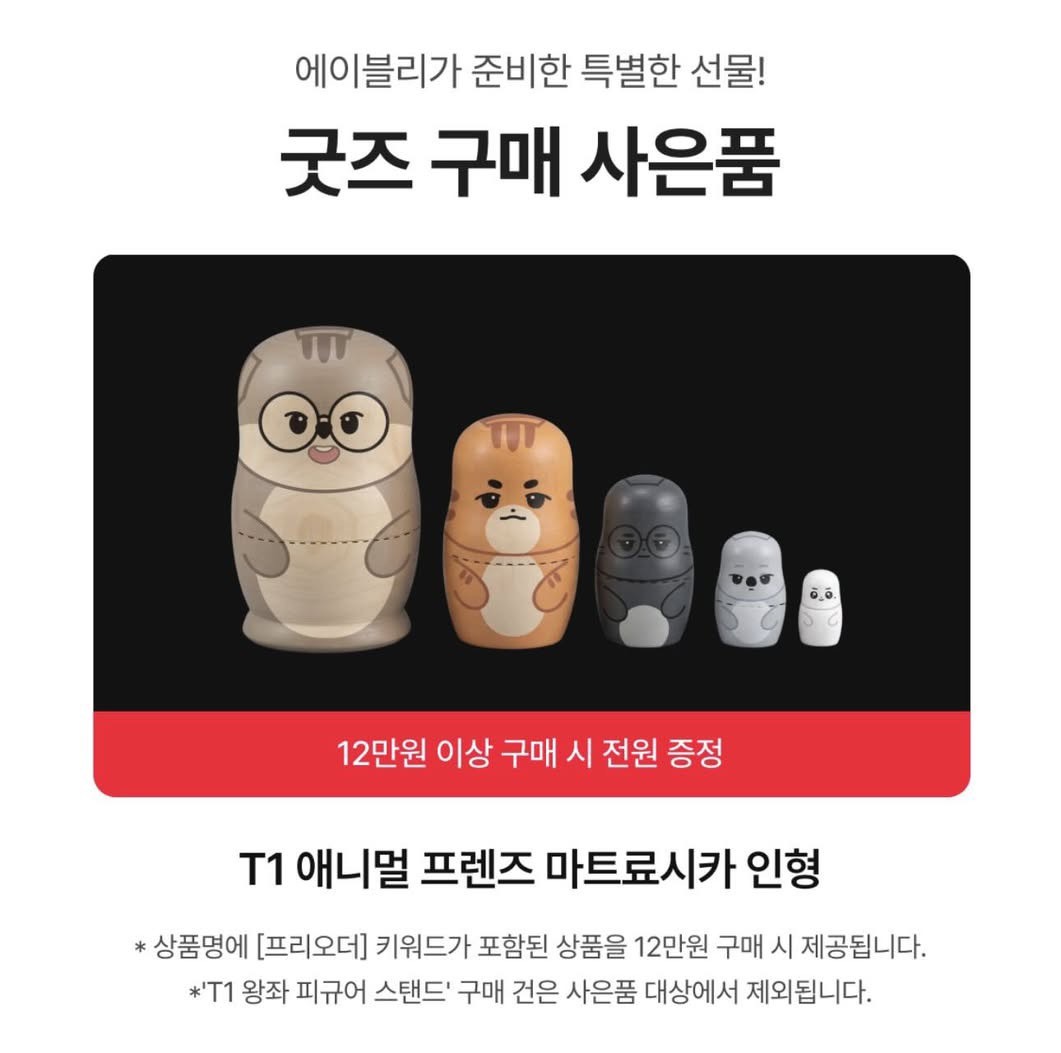 🎁 商品滿 12萬韓幣時,贈送T1動物好朋友俄羅斯娃娃套裝